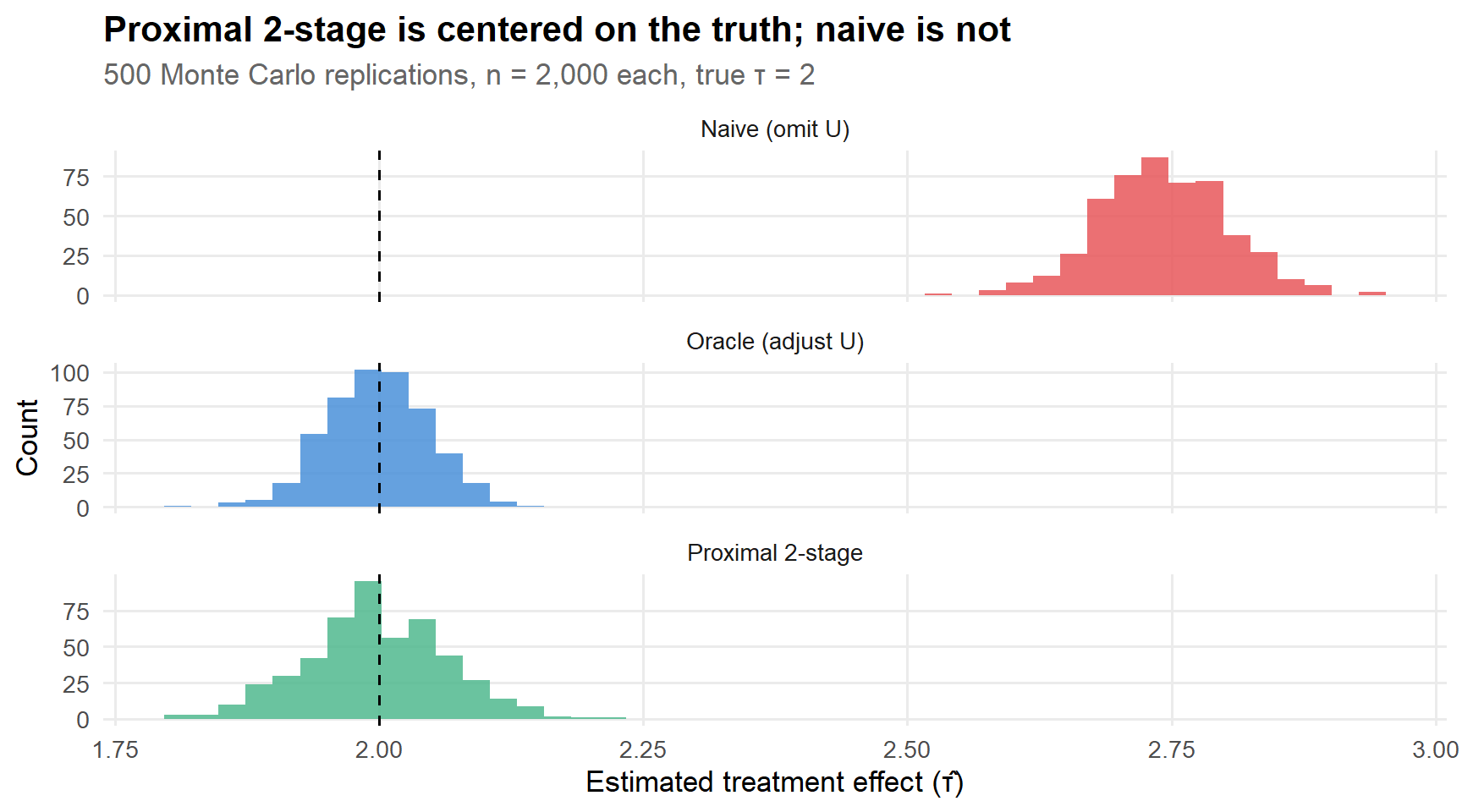 The story is clear: the naive estimator is systematically biased (its distribution is centered above 2), while both the oracle and the proximal estimator are centered on the truth. The proximal estimator is noisier than the oracle—you pay a variance price for not observing \(U\) directly—but it’s unbiased, which is the important thing.
