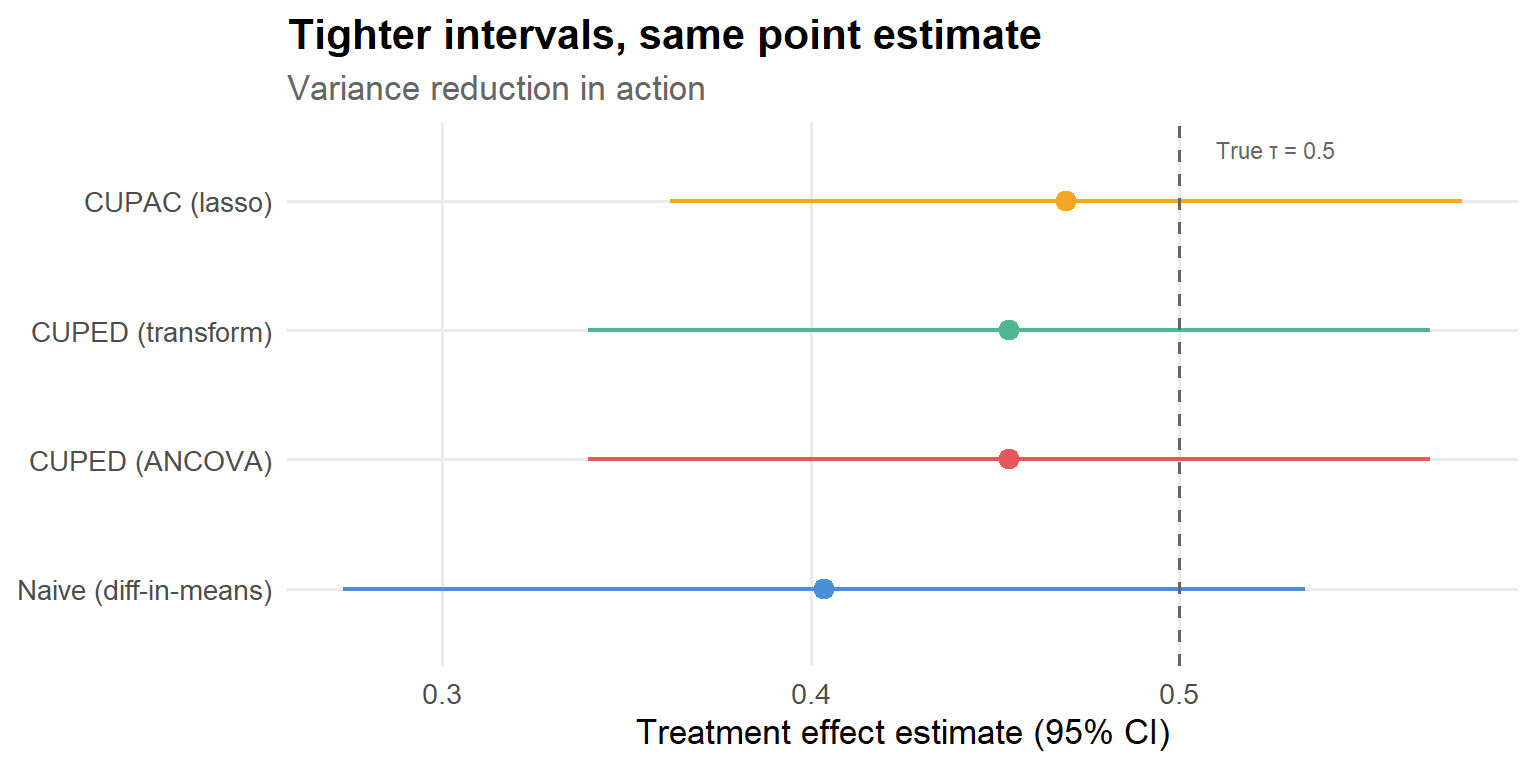 This is the punchline. All four methods recover approximately the same treatment effect—as they should, since they’re all unbiased for the ATE. But the confidence intervals shrink progressively as we use better covariates. The naive estimator’s interval is wide enough to be compatible with “no effect.” CUPAC’s interval is clearly bounded away from zero. Same data, different conclusion—just by being smarter about what you already know.