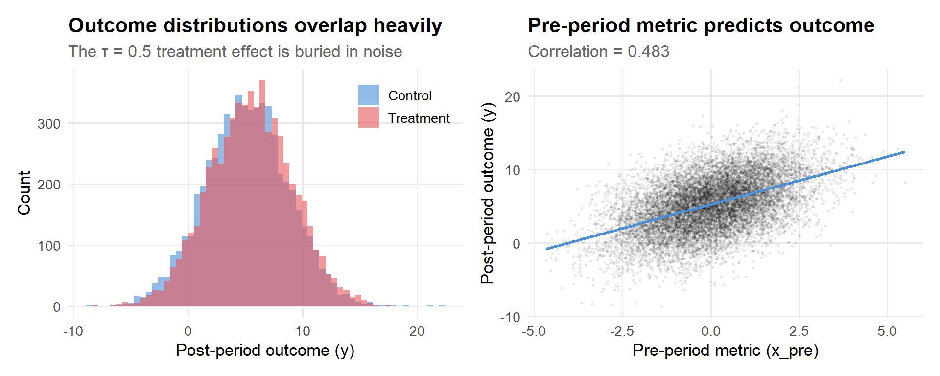The left panel tells you everything you need to know about why A/B testing is hard: the two distributions sit almost on top of each other. The treatment effect is real, but it’s small relative to the spread. The right panel is the reason CUPED works: the pre-period metric has a clear linear relationship with the outcome. That’s variance we can explain away.