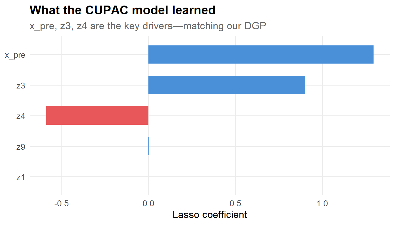 coef_lasso <-coef(cvfit, s ="lambda.min") |>as.matrix() |>as.data.frame() |>rownames_to_column("feature") |>as_tibble() |>rename(coefficient = s1) |>filter(feature !="(Intercept)", coefficient !=0)coef_lasso |>mutate(feature =fct_reorder(feature, abs(coefficient))) |>ggplot(aes(x = feature, y = coefficient, fill = coefficient >0)) +geom_col(show.legend =FALSE, width =0.6) +scale_fill_manual(values =c(pal[2], pal[1])) +coord_flip() +labs(x =NULL,y ="Lasso coefficient",title ="What the CUPAC model learned",subtitle ="x_pre, z3, z4 are the key drivers—matching our DGP" )