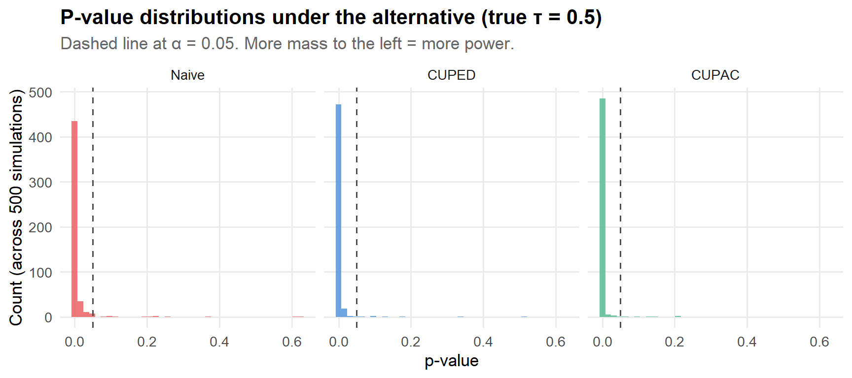 sim_results |>pivot_longer(everything(), names_to ="method", values_to ="pvalue") |>mutate(method =case_when( method =="p_naive"~"Naive", method =="p_cuped"~"CUPED", method =="p_cupac"~"CUPAC" ),method =factor(method, levels =c("Naive", "CUPED", "CUPAC")) ) |>ggplot(aes(x = pvalue, fill = method)) +geom_histogram(bins =40, alpha =0.8, show.legend =FALSE) +geom_vline(xintercept =0.05, linetype ="dashed", color ="grey30") +facet_wrap(~ method) +scale_fill_manual(values = pal[c(2, 1, 3)]) +labs(x ="p-value",y ="Count (across 500 simulations)",title ="P-value distributions under the alternative (true τ = 0.5)",subtitle ="Dashed line at α = 0.05. More mass to the left = more power." )