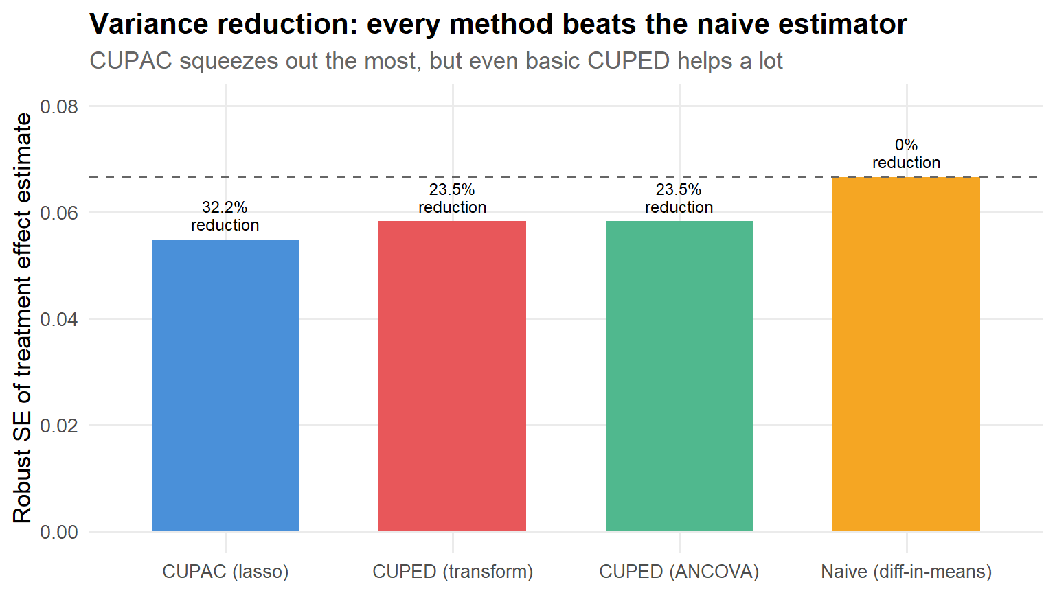 results |>mutate(method =fct_reorder(method, se)) |>ggplot(aes(x = method, y = se, fill = method)) +geom_col(width =0.65, show.legend =FALSE) +geom_hline(yintercept = se0, linetype ="dashed", color ="grey40") +geom_text(aes(label =paste0(var_reduction_pct, "%\nreduction")),vjust =-0.3, size =3.2, lineheight =0.9 ) +scale_fill_manual(values = pal) +labs(x =NULL,y ="Robust SE of treatment effect estimate",title ="Variance reduction: every method beats the naive estimator",subtitle ="CUPAC squeezes out the most, but even basic CUPED helps a lot" ) +coord_cartesian(ylim =c(0, se0 *1.2)) +theme(axis.text.x =element_text(size =10))